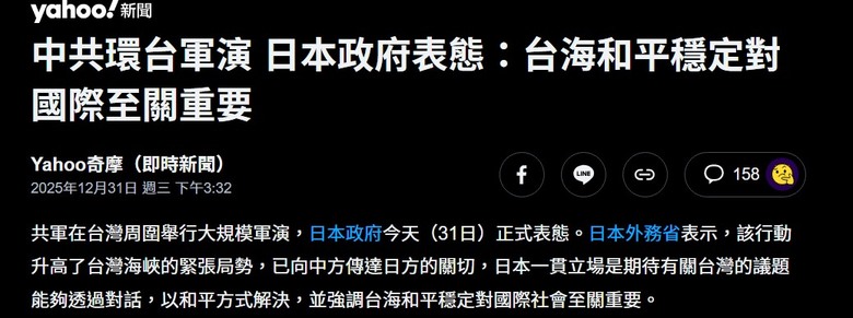 已向中方傳達日方的關切,日本一貫立場是期待有關台灣的議題能夠透過對話,以和平方式解決,並強調台海和平穩定對國際社會至關重要。===============這嘴砲威力,比1450遜多了,還需多練練......