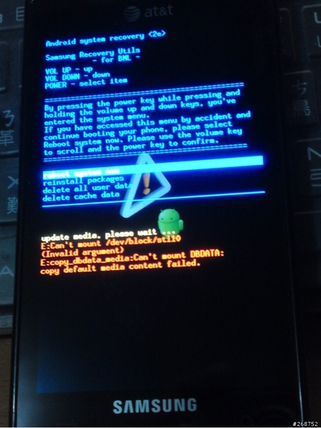 各位 CHing,因為先前曾刷上 i9000 的某一版本 2.2 rom 和 bug fix 的 kernel 後就出現下面的這個畫面了,用 Odin3 1-click 還原後是可以順利開機的,但當再刷上原版 ...