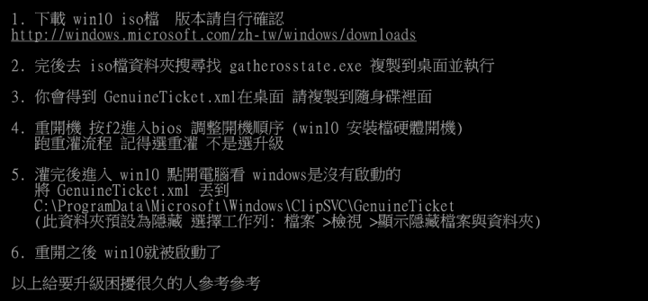 不好意思想請問各位~小的最近再升級win10本來是用win7升級到win10但最後失敗(可能是我前幾天才用筆電一鍵回復)所以改用usb乾淨安裝但最後win10啟用一直失敗我是採用ptt上網友分享的這篇:http...