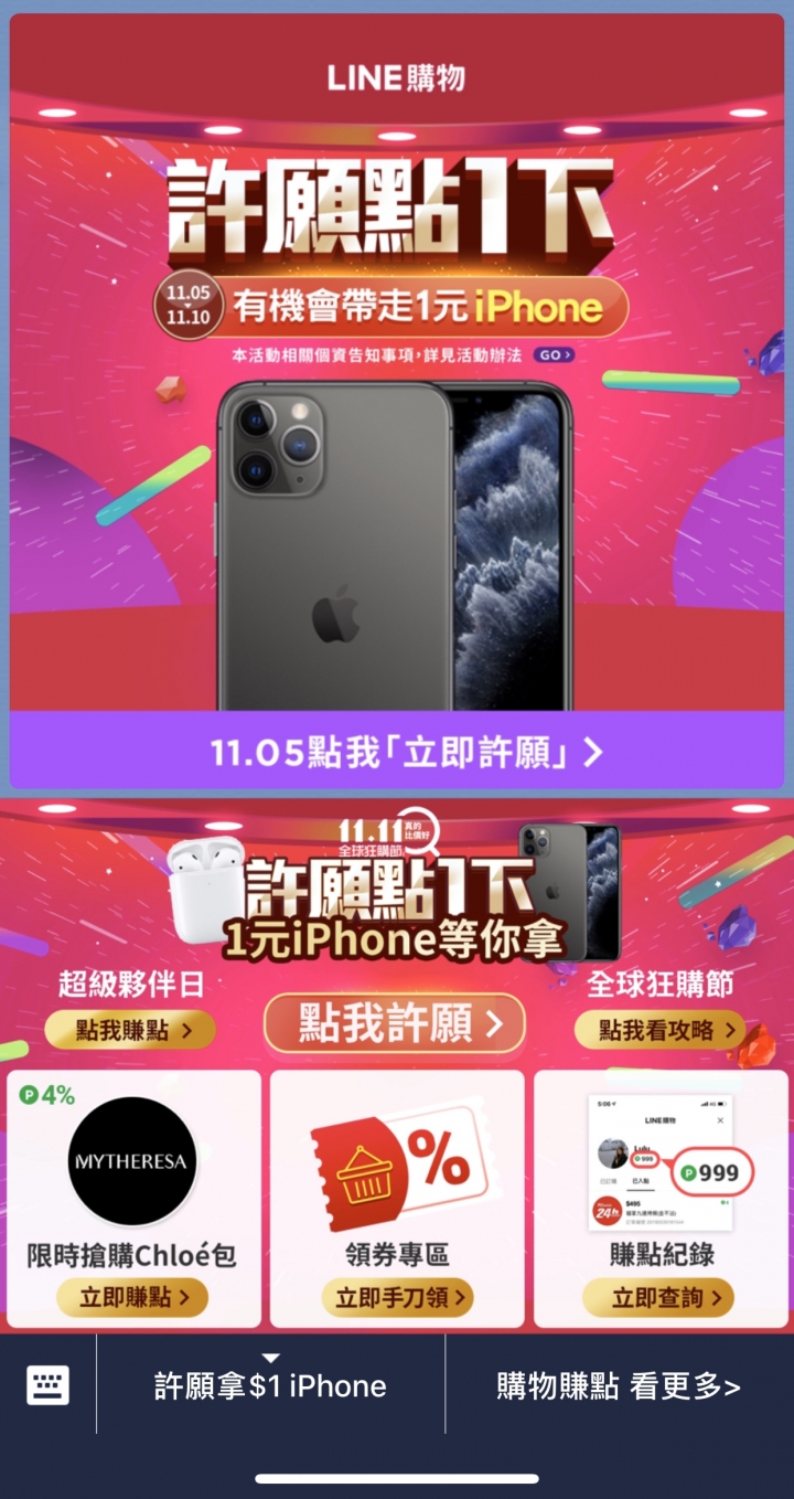 剛剛line購物跳訊息出來想說今天不是才5號嗎?離雙11還有快一週 現在可以直接iphone 11 pro & airpods拿出來抽除了蘋果系列還有保養品&LP 每天都可以抽同事9月搬家 他家裡電器&...