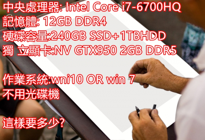 asus 15.6吋筆電中央處理器: Intel Core i7-6700HQ記憶體: 12GB DDR4硬碟容量:240GB SSD+1TBHDD獨 立顯卡:NV GTX950 2GB DDR5作業系統:wn...