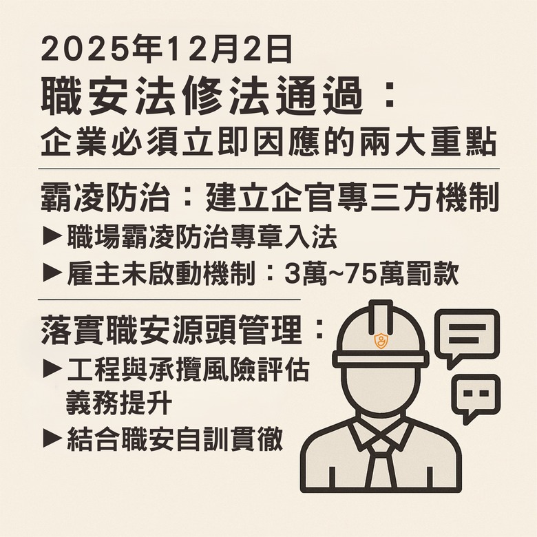 2025 年 12 月 2 日,立法院三讀通過《職業安全衛生法》重大修法,是近十年來最全面的調整。本次修法聚焦兩大方向:職場霸凌防治制度化、職安源頭管理強化,對企業的管理責任與流程要求大幅提升。我們為企業整理本...