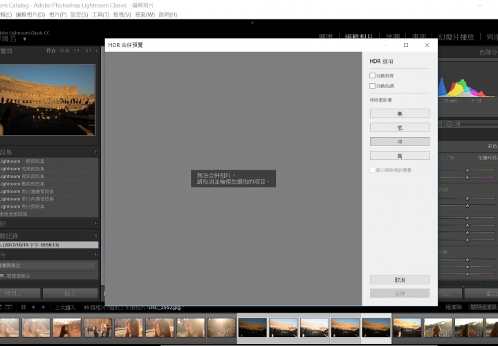 小弟是後製新手,今天剛下載lightroom自己摸索,想試試HDR我分別存了5張不同曝光程度的照片(JPG),點選合成相片>HDR,但顯示出來是無法合併。請問我操作上有甚麼問題嗎? 是不是因為他只接受RA...