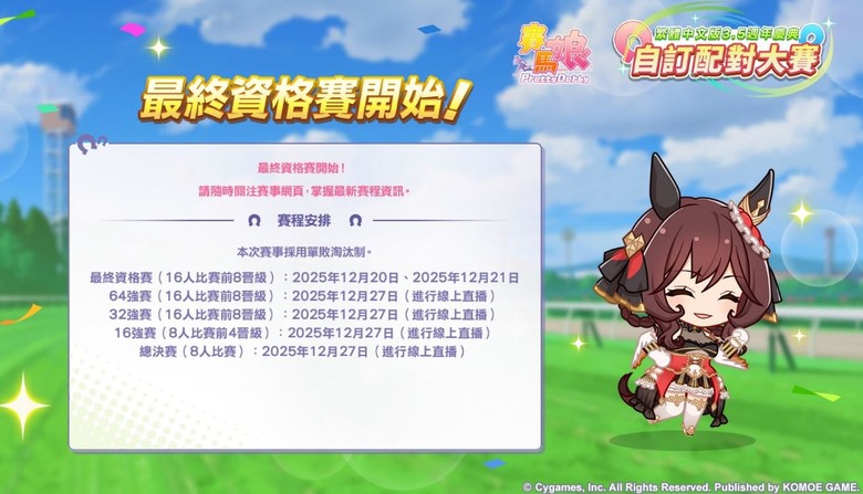 從三週年開始,小萌就特別有為台灣玩家舉辦自訂配對大賽,現在3.5週年小萌又舉辦了一次自訂配對大賽。目前進度再64強賽,海選、晉級賽、晉級賽第二輪、最終資格賽都已經結束,接下來大家會在12/27一決高下,到時會一...