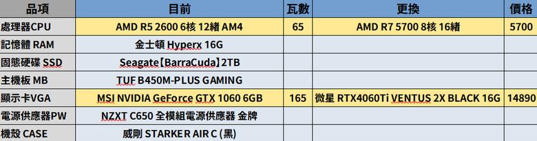 【 需求 】:遊戲/製圖方案一:目前配備如下,預計更換配件CPU跟顯卡,可能瓦數不夠會再更換電供方案二:重組>預算35000~45000更新:目前參照意見改成這樣(超預算一點點)再麻煩版友們提供意見,謝謝大家....