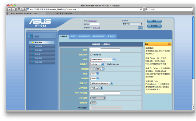 這台 RT-G32 b1 原本硬體上就能夠支援 11n ,但是好像被X碩用韌體封住當 11g機種在賣所以在 2.0.0.5 版韌體時印象中好像也沒在無線模式中看過 11n 的字眼,直到昨天...刷了 7.0.1...
