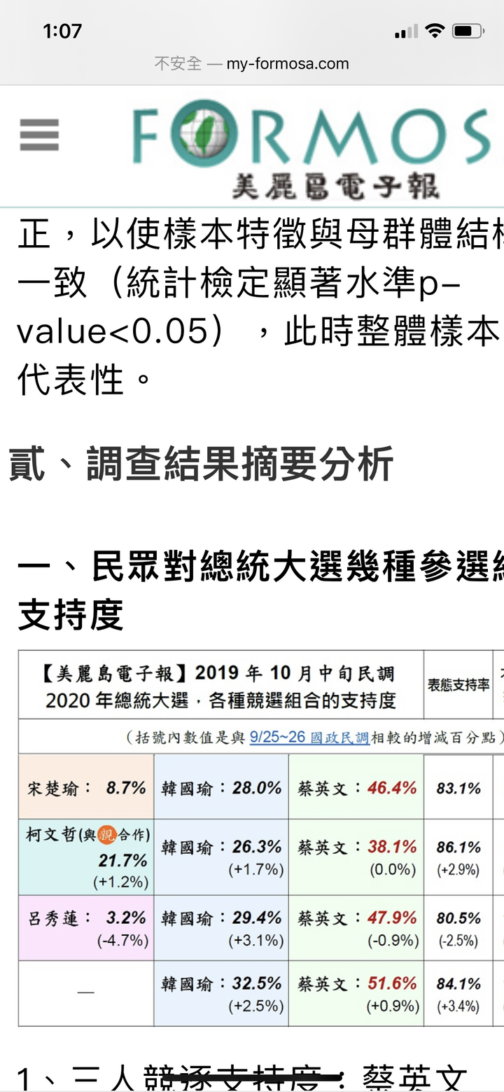 一、總統大選:蔡賴配50%(-1%)、韓張配31%(+2%)、宋余配6%(-1%)、未決定 13%(一) 年齡:1.20-29歲選民72%支持蔡,16%支持韓2.30-39歲選民54%支持蔡,21%支持韓3.4...